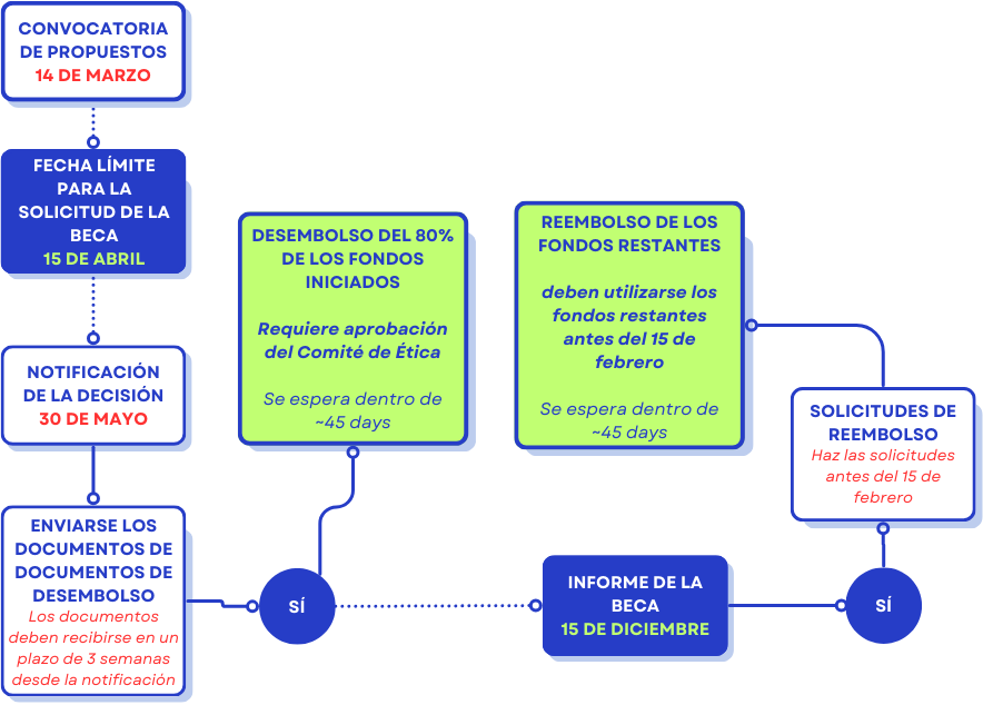 - Los fondos restantes deben gastarse antes del 15 de febrero de 2027 y se reembolsarán tras la entrega del Informe de Beca.