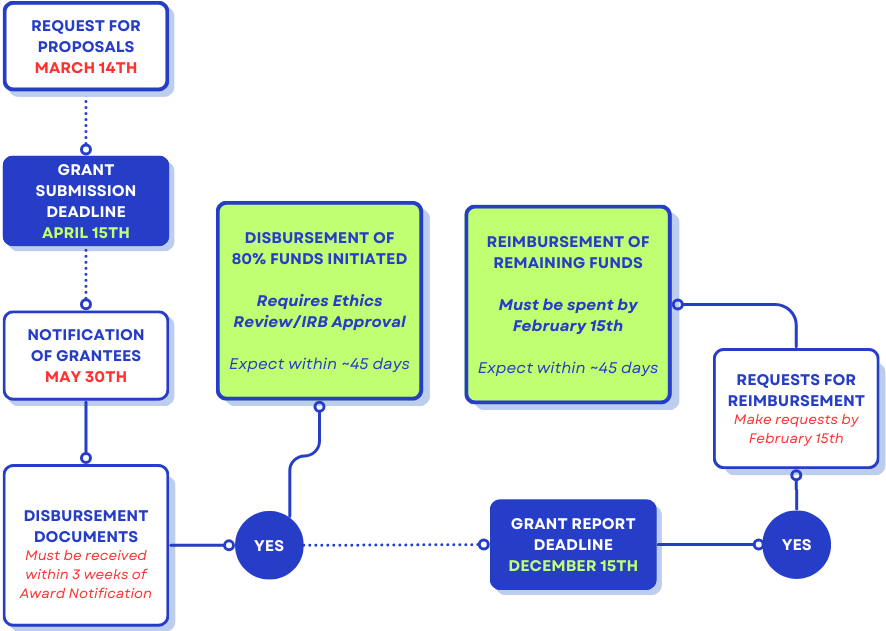 - After we receive proof of IRB or equivalent approval, as well as required disbursement documents, 80% of the funds will be distributed up front.