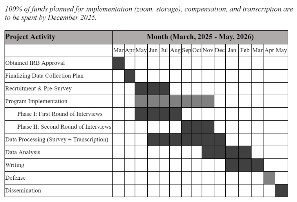 - A proposed timeline using general milestones (including proposal date, IRB submission, data collection, data analysis, defense, and dissemination) must be submitted with the application.